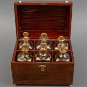 Mahoniegefineerde bureauvormige likeurkelder met zes glazen karaffen voorzien van gouddecoratie, 19e eeuw -gebruikssporen-, 22,5 × 27,5 × 19 cm
