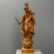 Houten beeld: Maria met Kind, onduidelijk gemonogrammeerd, tweede helft 20e eeuw -punt van staf gelijmd-, hoogte 107 cm