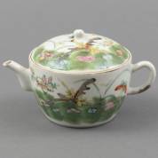 Chinees porseleinen theepot met polychroom decor van vlinders en zwaluwen, gemerkt, 19e eeuw -glazuurschilfer van greep, tuit en knop-, 10 × 17 × 12 cm