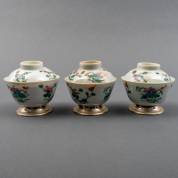 Drie Chinees porseleinen bedekte famille rose kommen met bloemdecor en staande op 2e gehalte zilveren voeten, het porselein 19e eeuw, de voeten 20e eeuw -enkele randschilfers aan de deksels-, 9 × Ø 10 cm