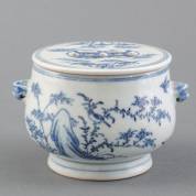 Bedekt Chinees porseleinen wierookvat met blauw-wit floraal en vogeldecor, circa 1900 -bodembarstje-, 8 × Ø 10 cm