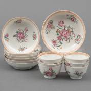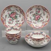 Drie Chinees porseleinen famille rose kommetjes en vier schoteltjes met bloemdecor, 18e eeuw -defecten-, schoteltje Ø 10 cm
