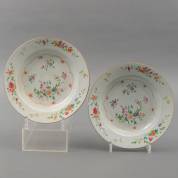 Paar Chinees porseleinen diepe borden met famille rose bloemdecor, Qianlong, -randschilfers-, Ø 23 cm