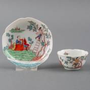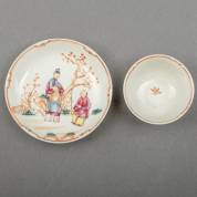 Chinees porseleinen kommetje en schoteltje met geschulpte rand en Amsterdams bont decor: kersenplukkers, Yongzheng -kommetje met randschilfer-, 3,2 × 9,8 cm