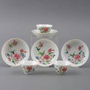 Zes Chinees porseleinen famille rose kommetjes en schoteltjes met bloemdecor, Qianlong, 4 × Ø 10,5 cm, daarbij een iets groter schoteltje, Ø 12 cm -twee kommetjes en het grote schoteltje met haarlijn-