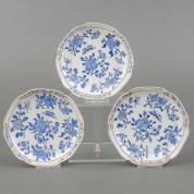 Drie Chinees porseleinen schoteltjes met geschulpte rand en blauw geëmailleerd bloem- en vlinderdecor, Yongzheng -minieme rimfrittings-, Ø 13,5 cm