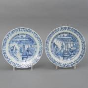 Paar Chinees porseleinen borden met blauw-wit 'Romance of the Western chamber' decor, omgeven door bloemenrand, Yongzheng/Qianlong -defecten-, Ø 23 cm