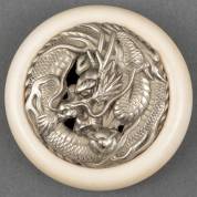 Ronde ivoren kagamibuta netsuke met centraal een wit metalen draak in reliëf, Japan, Meiji-periode (1868-1912) -kopie CITES EU-certificaat bijgevoegd, geen uitvoer buiten de EU-, Ø 5,3 cm