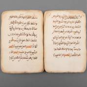 Toeareg handschrift, koranfragment op papier, in bruine en rode inkt. Gekartonneerd, blindgestempeld lederen etui uit de tijd. Algerije, 19e eeuw -kartonnage geheel versleten; bladen los, hoeken van de bladen afgerond, twee bladen beschadigd-, 16 × 11 cm