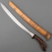 Stalen kortzwaard met gesneden houten heft met vogeldecor, de kling met inscriptie 'Tjisoerat R Mas 1895 B Oesa' en verso Arabische tekst, in houten schede, Zuidoost-Azië, lengte 54 cm -klein defect aan heft-