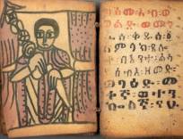 Ethiopisch handschrift met een bijbelfragment op perkament, 28 bladen in rode en bruine inkt, houten platten, met lederen etui, 19e eeuw. Met vier illustraties -een aantal bladen moeilijk leesbaar door watervlekken; lederen riempjes vervangen door wollen draden-, 6,8 × 5,2 cm