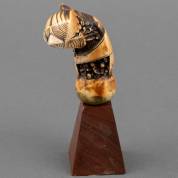 Ivoren krisheft in de vorm van Jawa Demam, Sumatra, 19e eeuw, staand op houten basement -kopie CITES EU-certificaat bijgevoegd, geen uitvoer buiten de EU, lichte slijtage door gebruik, verkleuringen-, 8 × 6,5 × 3 cm zonder basement