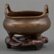 Bronzen wierookbrander op bladvormig houten basement, aan onderzijde gemerkt, China, 18e/19e eeuw, 7 × Ø 10 cm