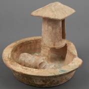 Chinese groengeglazuurde aardewerk 'mingqi' schaal in de vorm van een varkensstal, Han dynastie, 1e-3e eeuw, 21 × Ø 24 cm