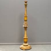 Goudkleurige gestoken houten kerkkandelaar, met acanthusbladdecor en staand op ronde voet, Italië, 19e eeuw -veel kaarsvet-, 115 cm