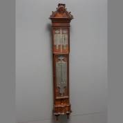 Bakbarometer in notenhouten kast, bekroond door gesneden vissen en rocaille, voorzien van tinnen schaalplaten en kwikthermometer met Fahrenheit- en Réaumurschaal, adres: J. Solaro, Amsterdam, laatste kwart 18e eeuw, 123 × 25 × 11 cm