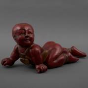 Rood lakwerk beeld: kruipende baby, China, 20e eeuw -slijtages-, 25 × 53 × 23 cm