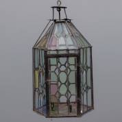 IJzeren hallantaarn met glas-in lood en houders voor drie kaarsen, 17e eeuw -defecten-, hoogte 72 cm