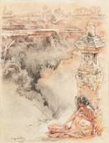 Willem Gerard Hofker (1902-1981), zicht vanuit de tuin van Abangan, Oeboed, conté op gepigmenteerd papier, l.o. en r.o. gesigneerd, en Bali. In 1947 gemaakt in opdracht voor Het Hollands Uitgevershuis, afmeting tekening 32,1 × 25,2 cm, papiermaat 43,5 x 35,8 cm, paginagroot afgebeeld in "Willem Gerard Hofker (1902-1981)", Hofker S. en Orsini G., 2013, pagina 147, afbeelding 186. Vergelijkbare tekening met hetzelfde uitzicht is te zien in "Willem Gerard Hofker, painter of Bali", Carpenter B. en Hofker- Rueter M., Picture Publishers, 1993, pagina 93, en de litho voor de kalender op pagina 143. Particuliere herkomst, direct aangekocht bij de kunstenaar, mogelijk in 1958 gedurende een tentoonstelling van Indonesische kunst in het Singer te Laren -volgrecht van toepassing-