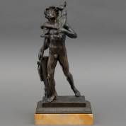 Bronzen beeld: Pan met schaap op zijn schouders en staf in de hand, bij een boomstronk waaraan een panfluit hangt, niet gesigneerd, Frankrijk, tweede kwart 19e eeuw, kopie naar een Romeins marmeren beeld uit 130-150 n.Chr. (Prado inv.nr. E000029), op zijn beurt een kopie naar Hellenistisch voorbeeld uit circa 150 v.Chr., 39,5 × 19 × 12 cm inclusief Sienamarmeren basement