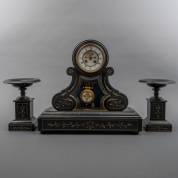 Driedelig zwart marmeren pendulestel met verguld sgrafittodecor, eind 19e eeuw -enkele chips, defect aan achterplaat-, pendule 48 × 52,5 × 16,5 cm