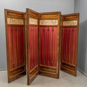 Zesslags massief palissander kamerscherm met ingelegde lichte biezen en marqueterie, een paneeltje met borduurwerk, en gesneden pijlen voor de donkerrode geplisseerde stoffering, tweede kwart 19e eeuw -stof met watervlekken en verkleuring-, 200 × 68 cm per deel