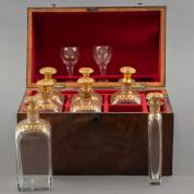 Mahoniegefineerde bureauvormige likeurkelder, het interieur met zes goudgedecoreerde glazen karaffen, twee glaasjes en ruimte voor een schaaltje, bijgevoegd een flacon -rand bijgeslepen-, 19e eeuw, 24,5 × 31,5 × 19 cm
