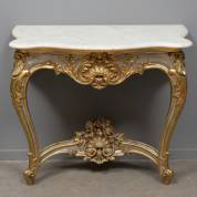 Deels vergulde wandtafel met wit marmeren blad en regelverbinding tussen de poten, rijkelijk gedecoreerd met schelpen en bloemen, 20e eeuw, 90 × 108 × 55 cm