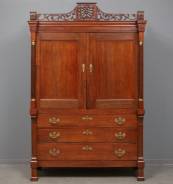 Eiken kabinet met drie lades en twee deuren waarachter twee planken en vijf lades, de kap bekroond door gesneden galerijrand, Hollands, 18e/19e eeuw -restauraties, delen getordeerd-, 231 × 153 × 51