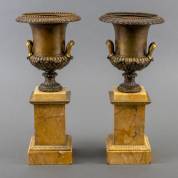 Paar gepatineerd bronzen siervazen met vergulde grepen, staand op Sienamarmeren basementen met vergulde monturen, Frankrijk, 19e/20e eeuw, 38 × Ø 16,5 cm