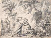 Aquarel: Harmonia omarmt en kust haar man Cadmus, die zojuist door de goden in een slang is veranderd, kort waarna zij hetzelfde lot zal ondergaan, niet gesigneerd, 18e/19e eeuw, 18 × 24 cm