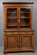 Notenhouten kast met glazen opstand en gesloten onderkast met twee deuren en twee lades, Willem III, 239 × 143 × 54 cm