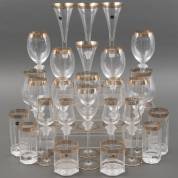 Kristallen glasserviesgedeelte met gouden meanderranden en gesatineerd Medusahoofd onder de kelk, model Medusa, ontwerp Versace, uitvoering Rosenthal Studio Line, bestaande uit 26 glazen waarvan sommige nog in oorspronkelijke verpakking: vijf grote wijnglazen, vijf kleine wijnglazen, twee Bourgogneglazen, vier flûtes, vier grappaglazen, twee whiskeytumblers, twee hoge longdrinkglazen en twee middelhoge longdrinkglazen