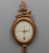 Barometer met beschilderde ovale wijzerplaat achter glas, waarop een alcoholthermometer met Réaumurschaal, de goudkleurige houten lijst met parelrand en bekroond door gesneden adelaar, Frankrijk, Louis Seize, 88 × 45 × 6 cm