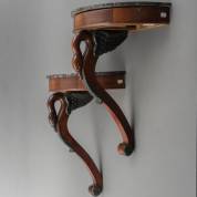 Paar mahonie consoles met natuurstenen blad, de poot in de vorm van een zwaan, Frankrijk, begin 20e eeuw -één applique onderaan poot ontbreekt-, 50 × 40 × 22 cm