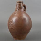 Donkerbruine steengoed baardmankruik met Amsterdams pseudowapen, Stadtlohn / Vreden, eerste helft 18e eeuw -oppervlak wat gebarsten, mogelijk bakfouten-, 33 × Ø 21,5 cm