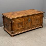 Notenhouten kist met intarsia: bloemen en zuilen, het interieur met acht lades en een afsluitbaar vak, met vier losse bolpoten, Oostenrijk, circa 1700 -defecten-, 52 × 128 × 62 cm