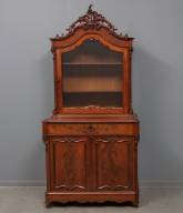 Mahonie bonheur bekroond door gestoken kuif, de beglaasde bovenkast met twee schappen, in de onderkast twee deurtjes en lade met uitklapbaar schrijfcompartiment, Willem III -gebruikssporen, met losse originele achterwand-, 220 × 104 × 53 cm