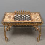 Schaaktafeltje met natuurstenen blad en bronzen onderstel, inclusief metalen schaakstukken, 45 × 76 × 51 cm