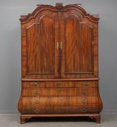 Mahoniegefineerd kabinet met drie lades in de enkelgebogen onderkast, de kap met gesneden portretmedaillon, het geheel staand op bolklauwpoten, late Louis Quinze -kapornament ingekort, delen nog aanwezig-, 235 × 190 × 75 cm