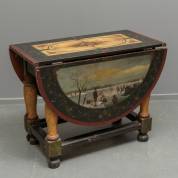 Amelander beschilderde hangoortafel met centraal een floraal decor, aan één zijde een decor van een zeeslag, aan de andere zijde ijsvermaak, gemonogrammeerd K.P.,19e eeuw, maat uitgeklapt, 43 × 145,5 × 95,5 cm