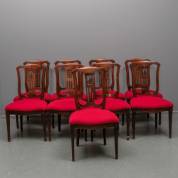 Negen stoelen met rode stoffen bekleding en opengewerkt bloemdecor in de rug, Chippendale-stijl, 20e eeuw, 99 × 51,5 × 45 cm
