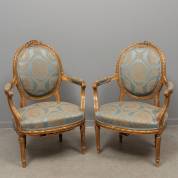 Paar vergulde medaillonstoelen met grijsblauwe bekleding, Louis Seize -stukje krulornament ontbreekt, stukje passement los, lichte slijtages aan vergulding-