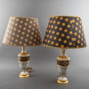 Paar tafellampen met goud en zwart leeuwendecor, met bijpassende kappen, Versace-stijl, modern -één kap verkleurd, enkele kleine krasjes-, hoogte inclusief kappen 85 cm × Ø 56 cm