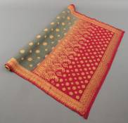 Rode zijde schouderdoek kain songkèt, de rand en het centrale deel met gouddraad geweven bloemmotieven, Palembang, Sumatra, Indonesië, eerste helft 20e eeuw -defecten, groene deel verkleurd-, 190 × 78 cm