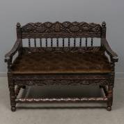 Koloniale hardhouten bank met rijk gestoken decor van bloemen en ranken, getorste spijlen, olijfgroene gecapitonneerde zitting en de poten verbonden door regels, 18e eeuw -twee spijltjes in de rug en regel tussen de achterste poten ontbreken-, 84 × 104 × 71 cm