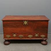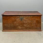 Grote koloniale hardhouten compagniekist, aan achterzijde met VOC-brandmerk, waarboven een 'C', mogelijk Ceylon? en 'Ao 4', 18e eeuw -één moer van handvat vervangen door loden exemplaar waarvan de schroefdraad niet meer pakt, stukje van deksel afgebroken linksvoor-, 70 × 168 × 73 cm