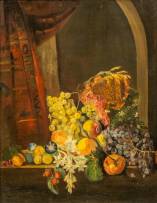 Schilderij: bloem- en fruitstilleven, olieverf op doek, niet gesigneerd, 19e/20e eeuw, 90 × 70 cm