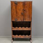 Notenhouten voorraadkast met één deur waaronder twee open planken met decoratieve rand, smeedijzeren hang- en sluitwerk, op slofpoten, 18e eeuw -slijtage-, 169 × 85 × 41 cm