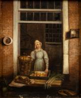 Hollandse School: de groenteverkoopster, olieverf op paneel, niet gesigneerd, 19e eeuw, 25 × 21 cm